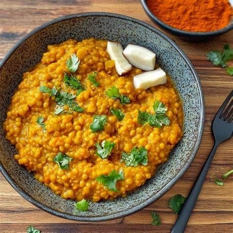 Lave bem o moong dahl até que a água saia limpa. Coloque em uma panela com água suficiente para cobrir e leve ao fogo médio. Cozinhe por cerca de 15 a 20 minutos, ou até que as lentilhas estejam bem macias e quase desmanchando. Reserve, mantendo um pouco da água do cozimento.